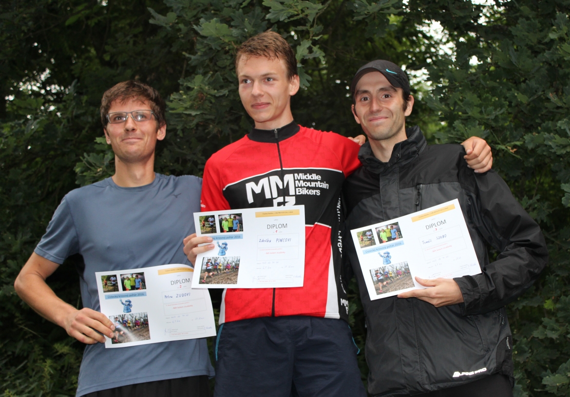 I to svědčí o tom, jak je čerstvý maturant běžecky vyspělý, a i v tomto článku se musím pozastavit nad jeho výbornou vytrvalostí. Závod jasně ovládl. Pokud by přítomný fotograf Ústeckého deníku a náš příležitostný přispěvovatel p. Vlach měl infračervený fotoaparát, mohli bychom na fotografiích druhého Petra Zudy vidět hojící se zranění šlachy, i tak bral tento ústecký borec celkové druhé místo před Jirkou Vlčkem, vítězem kategorie "mladších veteránů". Za ním doběhl Tomáš Szabo, třetí mezi nejmladšími, následovaný Lukášem Eliášem a Miroslavem Svobodou, kteří stáli na bedně s Jirkou Vlčkem. Míra Svoboda byl v dobré náladě již před závodem, jeho nedělní rekordní desítka po běžecké reinkarnaci mu stále ještě dodávala jak energii fyzickou tak hlavně psychickou. Dalším v cíli byl už Vláďa Růžička, vítěz těch pravých veteránů.